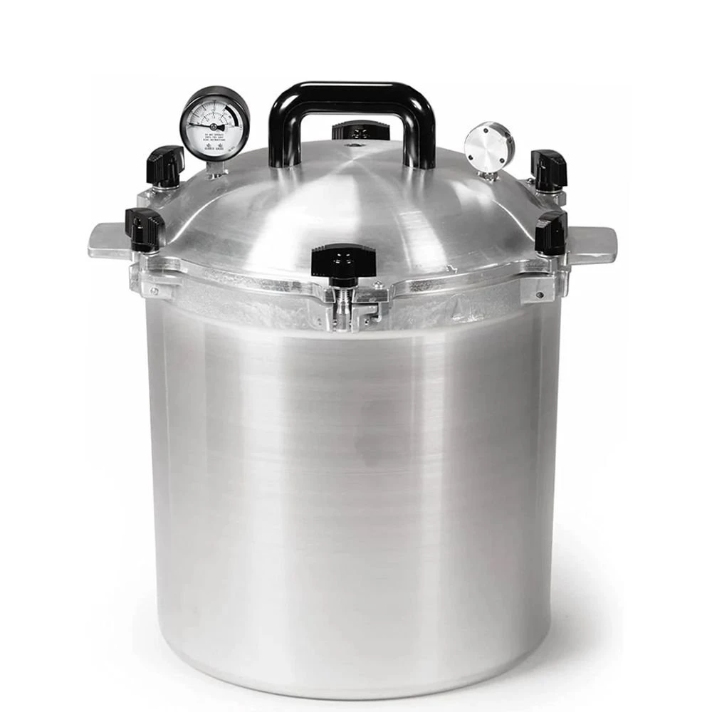 Easily preserve and store your own farm-raised and homegrown food with All American 1930’s No.925 Pressure Canner & Cooker! Made of heavy-cast aluminum, this pressure canner will help you preserve several seasons of homegrown goods. Pressure canning is the only safe way to preserve low-acid foods, such as meats, fish, beans, squash, and melons. By processing foods at higher heat with the use of specialized equipment, pressure canning eliminates the worry of harmful bacteria – allowing you to easily fill your pantry shelves with homemade, worry-free foods that will keep just as long as store-bought canned goods. All American 1930’s exclusive “metal-to-metal” sealing system keeps the canner safely locked without the use of a gasket, which prevents cracking, breaking, and the need to replace extra pieces. Positive action clamping locks align the cover to the base with wing nuts securing it in place – creating a steam-tight, secure seal while still letting you easily remove the cover. The pressure gauge allows for easy monitoring of the internal pressure, while the automatic overpressure release ensures the cooker does not retain too much pressure. Built to last generations and American-made since 1930, the All American No.925 Pressure Cooker & Canner is the choice addition to any budding homesteader or serious cook’s kitchen.