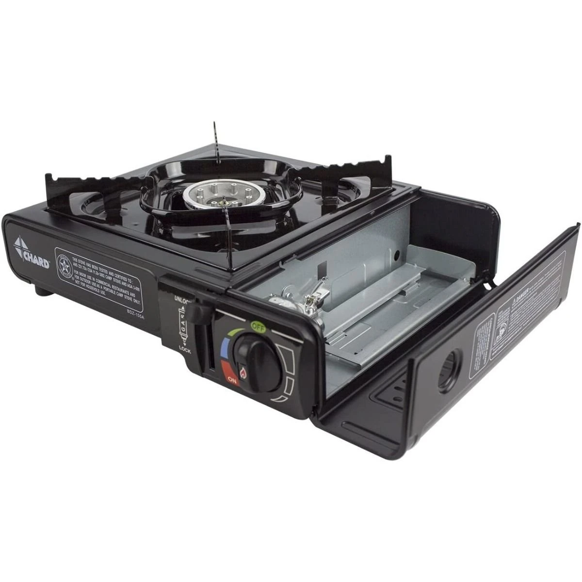 The Chard Single Burner Butane Camp Stove is the perfect tool for on-the-go outdoor cooking. Portable and reliable, this camp stove is great for tailgating, camping and hiking. This stove features a butane cartridge locking system and safety shut off system. The Piezo-electric starter and fully adjustable heat-control dial ignites and regulates the flame. The burner provides an 8,500 BTU flame and the cooking area allows for one 10 Inch pan. Includes a portable carrying case with convenient canister storage. The drip tray surface is enamel to ensure easy clean up. CSA Approved. For outdoor use only.