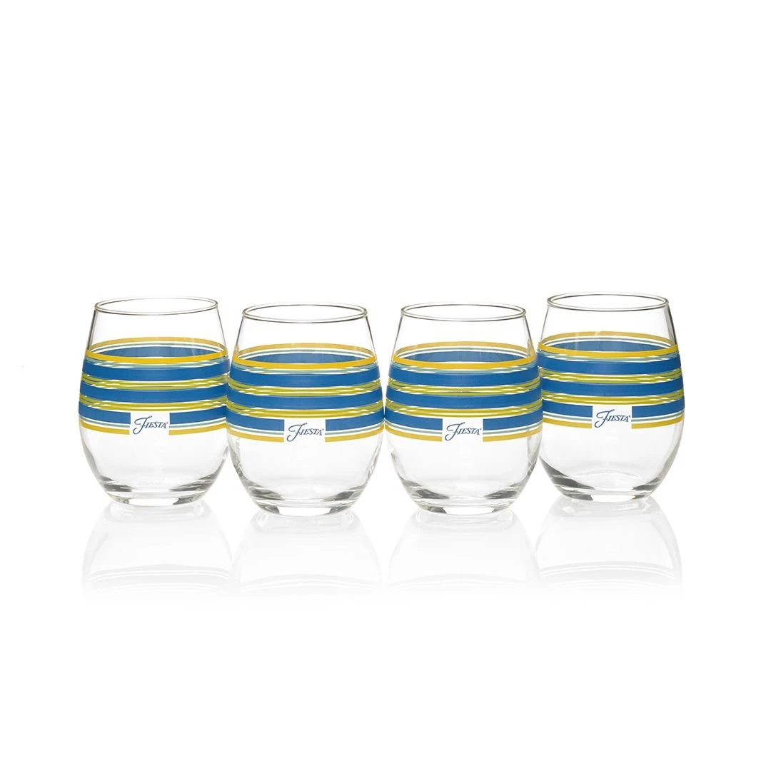 Serve your favorite wine in fun and festive Fiesta® colors with the Stemless Glassware Set in Cool Stripes! Crafted of lead-free high-quality glass and proudly made in the USA, these stemless glasses are perfect for serving wine & cocktails at dinner or milk & orange juice with breakfast. With Lapis, Lemongrass, Turquoise, and Sunflower stripes, these elegant glasses will look great with any of your blue, green, and yellow Fiesta® pieces or as a colorful accent with your existing dinnerware. Add a pop of color to your dinnerware collection with the Fiesta® Stemless Glassware Set today!