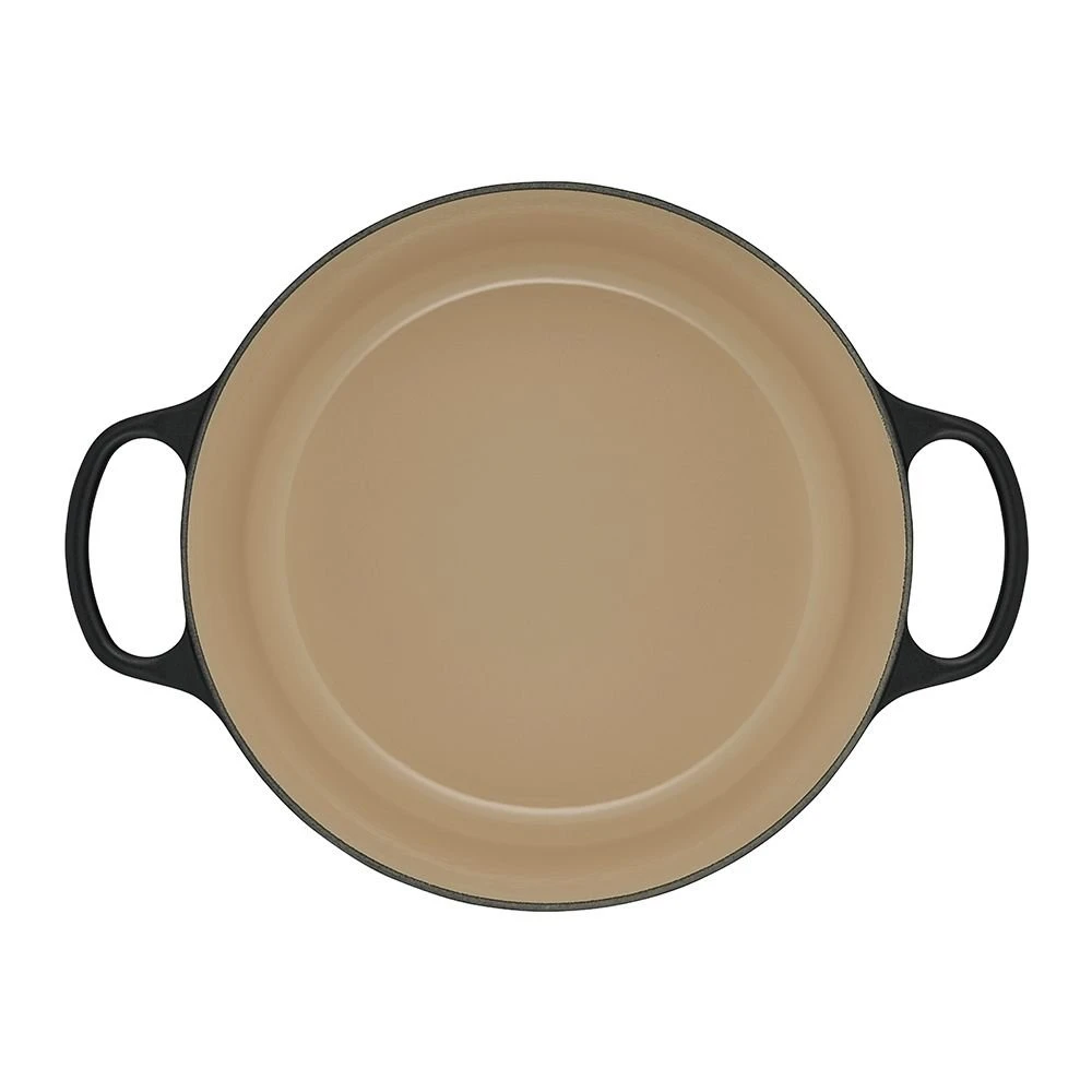 - Interior sand-colored enamel has a smooth finish that promotes caramelization while it prevents sticking and resists staining