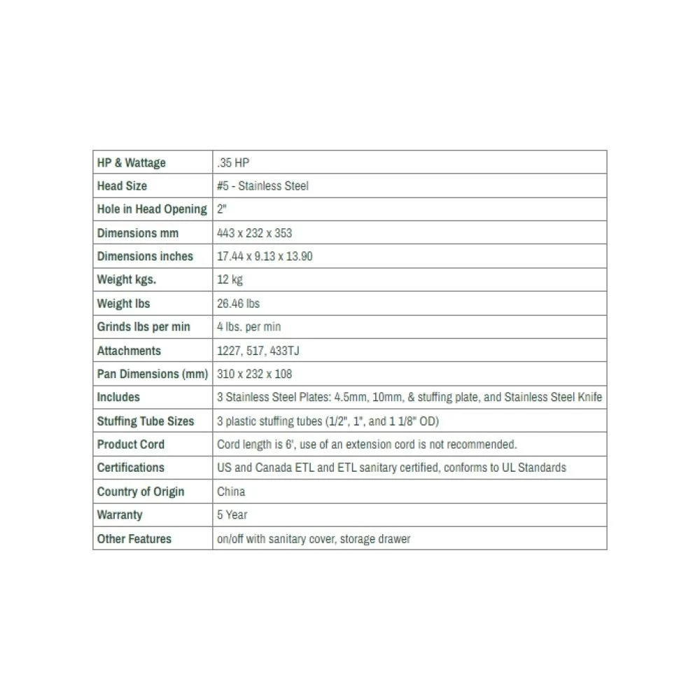 - Includes: meat stomper, stainless steel knife, stuffing plate, 2 stainless steel plates (3/8” coarse, 3/16” fine), 3 stuffing tubes (1/2″, 1″, 1-1/8″ OD), large meat pan
