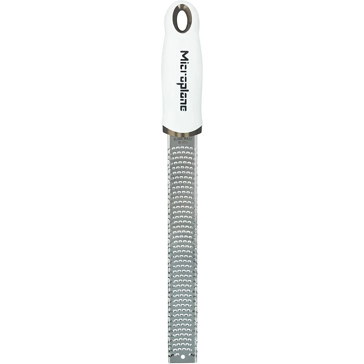 The Microplane Premium Series Zester & Grater White has moved from the workshop to the kitchen. The iconic long, narrow rasp-style design is made of a surgical grade stainless steel blade with a comfortable soft-touch handle and non-scratch end tabs to grate even the hardest Parmesan Reggiano cheese. Hold the lemon in one hand and the Zester with the side up as if it were the neck of a violin. The zest collects in the upper channel with lacy fine shavings of zest–no more grated knuckles!
