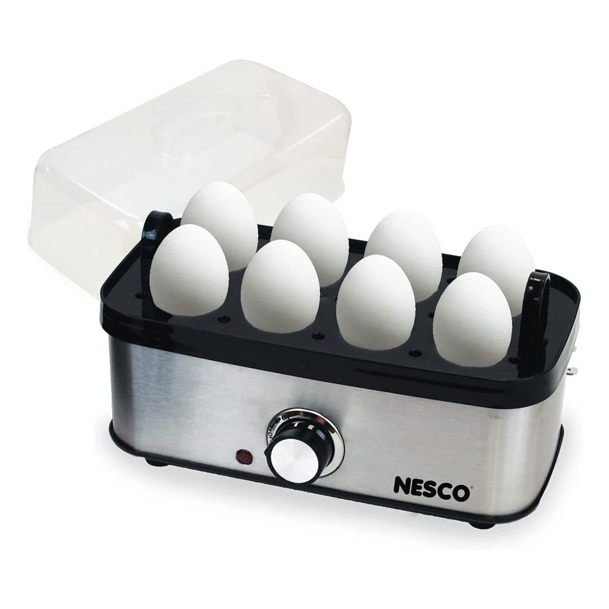 When it comes to cooking eggs, the Nesco Deluxe Egg Cooker is the best appliance for your kitchen! Made from BPA-free plastic and stainless steel, this egg cooker delivers high-quality performance at 400 watts and cooks up to eight eggs at once. Simply utilize the piercing pin from the measuring cup to puncture the eggs, add the right amount of water inside the heating base, power on the egg cooker, and let the auto shut-off alarm sound off for hard, medium, or soft-boiled consistencies. With a clear, vented BPA-free lid, you may observe the cooking process. This appliance is perfect for those who love egg salad, deviled eggs, or poached eggs. Included with the egg cooker is a poaching tray that allows you to poach up to three eggs. Backed by a year-long manufacturer warranty, the Nesco Deluxe Egg Cooker will provide the best eggs for breakfast, brunches, and more for years to come!