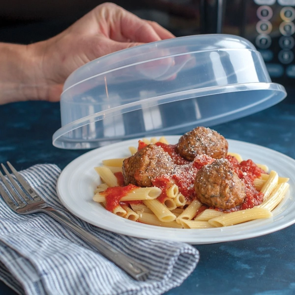 - Prevents food spatter in your microwave by covering plates when heating