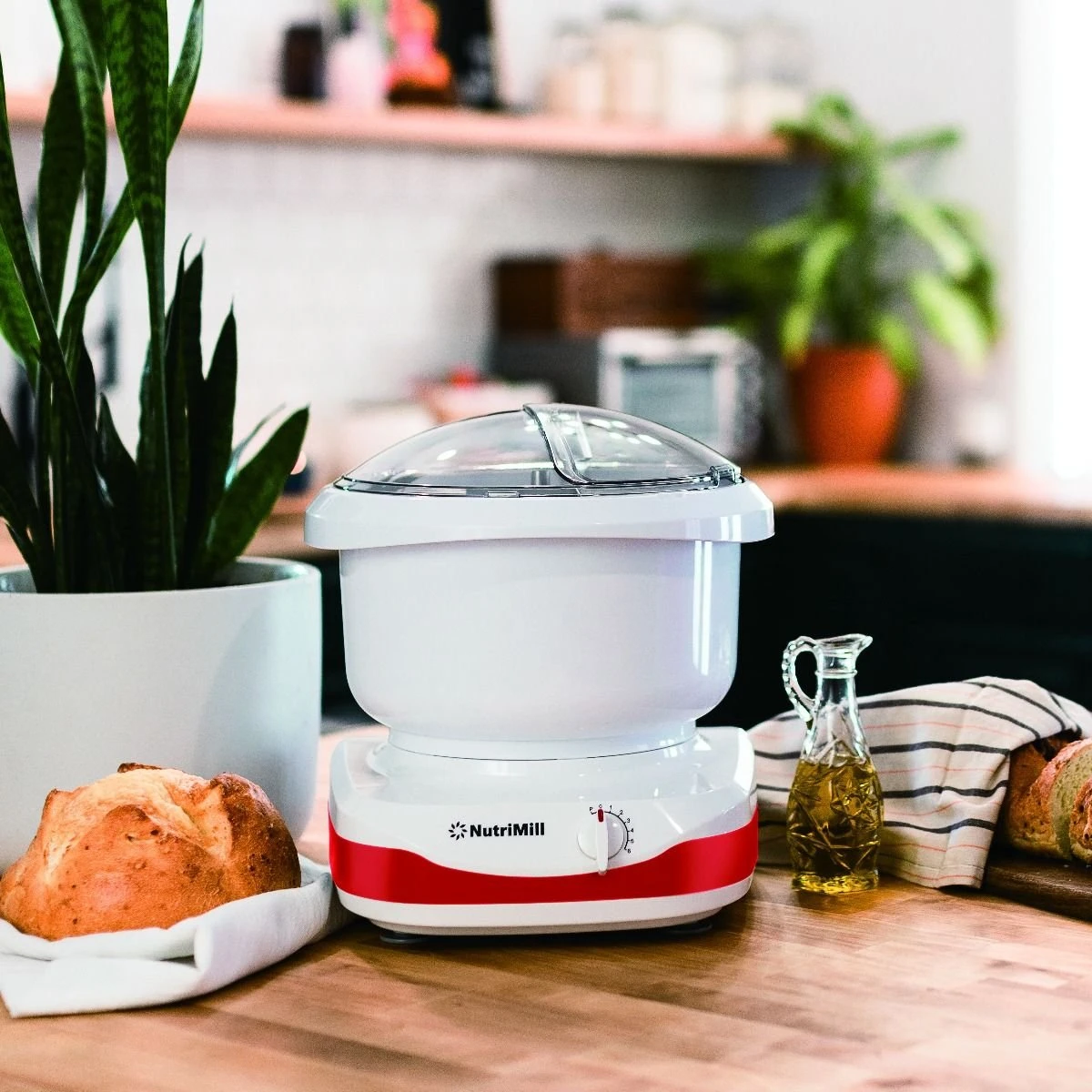 Big power comes in a modern, compact package with the Artiste Complete Stand Mixer from Nutrimill. Lightweight but efficient, this Nutrimill stand mixer in white with red trim comes equipped with a 650-watt bottom drive shaft driven motor. 6 speeds and a pulse setting in combination with either the wire whip or uniquely designed extended dough hook makes short work of mixing or kneading up to 10 lbs of dough. The 5 quart easy grip bowl and see-through splash guard makes it so that you can easily add ingredients during the mixing process and monitor progress. Use in tandem with a Nutrimill Grain Mill to make anything from delicious artisan breads to delicate desserts!