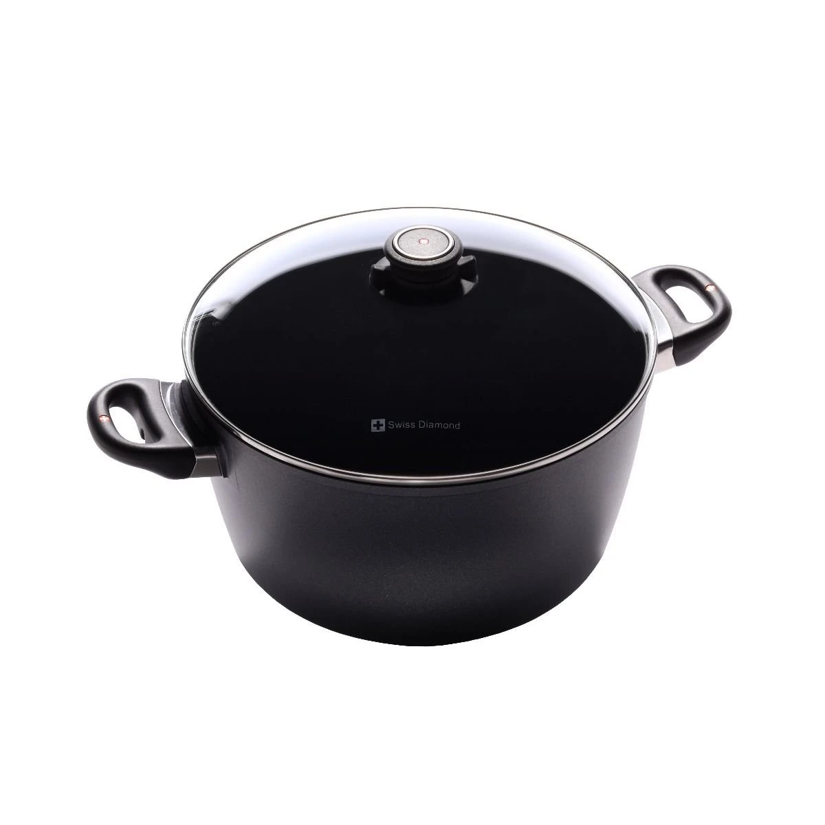Our large capacity 8.5qt deep Swiss Diamond stock pot is an 8 1/2 quart nonstick stock pot and has two side handles. This nonstick stock pot/soup pot also has a vented metal-rimmed heat-tempered glass cover and is perfect for slow simmering for stocks, soups, pasta, vegetables, and lobsters.