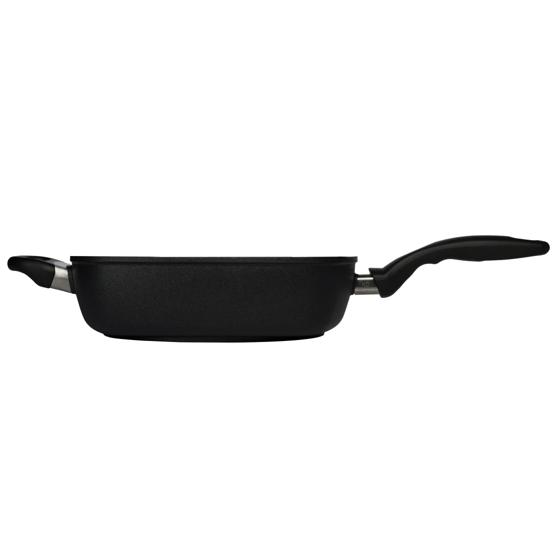 This Swiss Diamond XD Nonstick 11” Square Deep Grill Pan is perfect for preparing, cooking and serving all your favorite grilled vegetables and meat in one pan. This easy-to-clean non-stick pan is rivet-free and protects against bacteria. The comfortable, ergonomic, stay-cool handles can withstand heat up to 500°F so you can transition effortlessly between stovetop to oven.