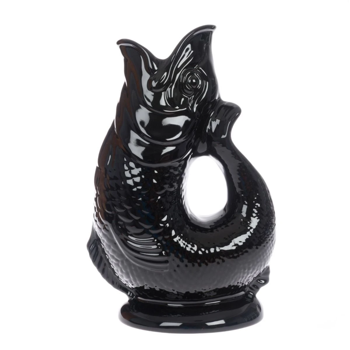 A classic British design since first manufactured in the 1860s, the Extra Large Gluggle Jug (Black) from Wade Ceramics brings a fun and vibrant feel to any tablesetting or decor! The Gluggle Jug is crafted from lead-free, fully vitrified ceramic and is glazed inside and out so it is waterproof and food-safe, providing the famous and entertaining “gluggling” sound whether you use it to pour drinks at the table or water the houseplants. The classic arched fish design features finely detailed fins and scales and the classic Black finish makes a statement anywhere you display it. Use it to hold a centerpiece or fresh-cut flower arrangement, or bring a touch of whimsy to your countertops and store your most-used kitchen utensils close at hand. Hand cast, hand dipped, and hand finished with select materials in Staffordshire, England, at the heart of the British ceramics industry, Wade Ceramics Extra Large Gluggle Jug (Black) is ornamental enough to grace the mantle or bookshelf as a decorative piece and durable enough for everyday use as a vase, jug, desk or countertop organizer, and more!